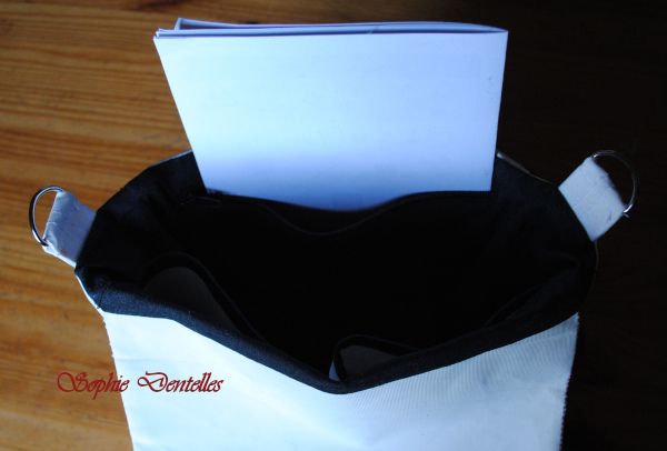 Sur les côtés des anneaux pour attacher avec des mousquetons une future bandoulière, qu'il a prévu d'acheter. Doublure noire fournie. À l'intérieur une double poche avec un léger soufflet, avec la voile en simple épaisseur (c'est assez solide) et bordée d'un biais.
